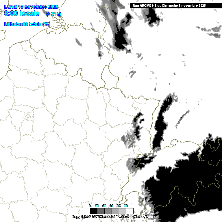 Les bancs de brouillard et les nuages bas se montreront à nouveau nombreux. Aussi, seul le Massif des Vosges ressortira de la grisaille en matinée.