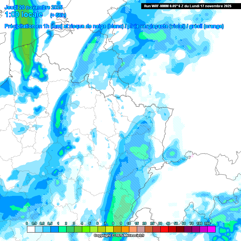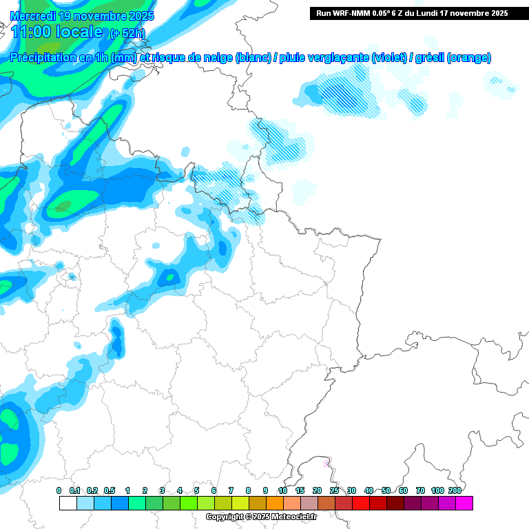 Précipitations attendues ce mercredi 19 novembre à 11h du matin dans le nord-est de la France (source : Meteociel, modèle WRF NMM)