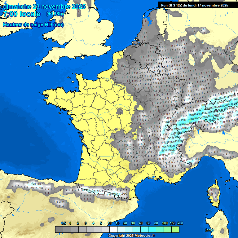 Hauteur de neige (en centimètres) attendue le dimanche 23 novembre en France (source : Meteociel, modèle GFS)