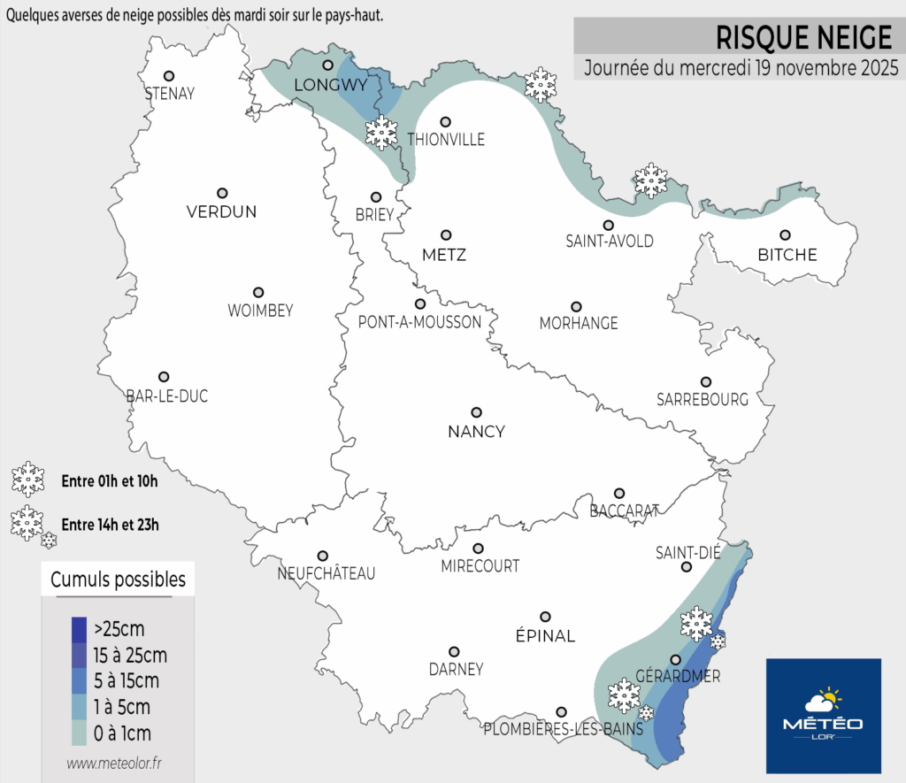 En cours de nuit, neige pouvant tenir au sol sur ce même secteur, ce jusqu’à demain matin vers 9/10h. Sous les 350m, tenue difficile voire absente (prudence néanmoins). De 1 à 2cm, localement 4cm possibles dans le secteur de Aumetz.