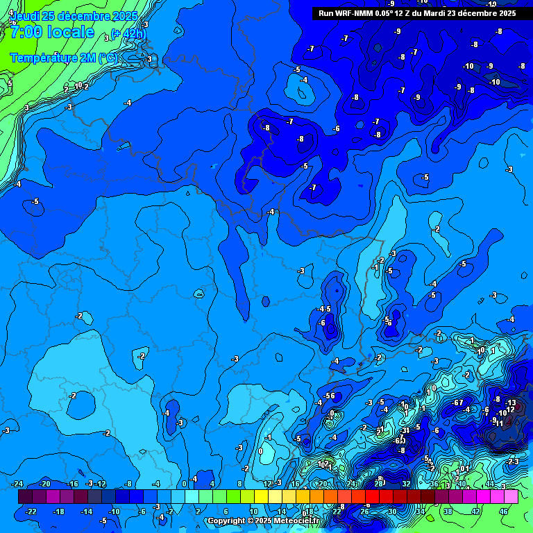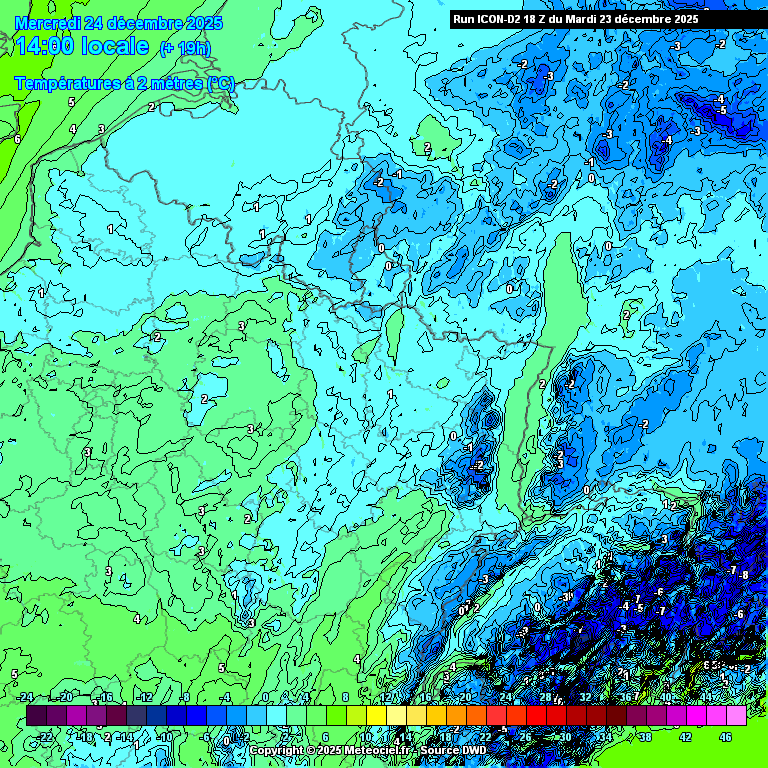 Le 25 décembre, la baisse des températures se poursuivra. Aussi, il fera de -5 à -2°C. En journée, le dégel sera parfois incertain en plaine. Les valeurs maximales seront alors comprises entre 0 et 3°C.