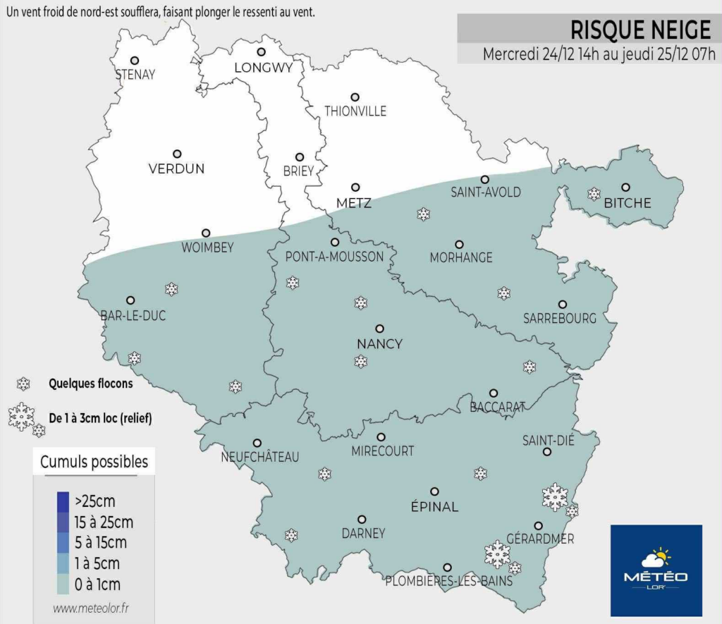Par ailleurs, la grisaille sera importante en journée, même si des éclaircies feront leur apparition l’après-midi, surtout dans le nord de la Lorraine. En fin de journée, des brouillards givrants et de fines chutes de neige se produiront, notamment en direction du département des Vosges, dans le sud de la Meurthe-et-Moselle et en Moselle-est. Ces faibles précipitations se poursuivront durant le Réveillon de Noël.