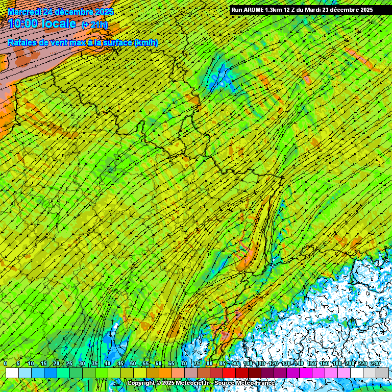 La bise continentale se renforcera également, les rafales de secteur nord-est devant atteindre de 50 à 60 km/h en plaine (jusqu’à 80 km/h en direction des sommets vosgiens). Ce dernier renforcera grandement la sensation de froid.