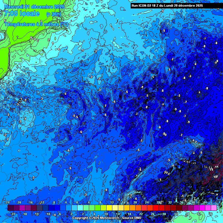 Mercredi, les minimales en plaine repartiront à nouveau à la baisse. À l’aube, les valeurs minimales oscilleront généralement entre -8 et -4°C (jusqu’à -9°C ou -10°C dans certaines vallées et à proximité du Massif des Vosges). En journée, le dégel sera également incertain, les valeurs maximales devant être comprises entre -1 et 1°C en plaine.