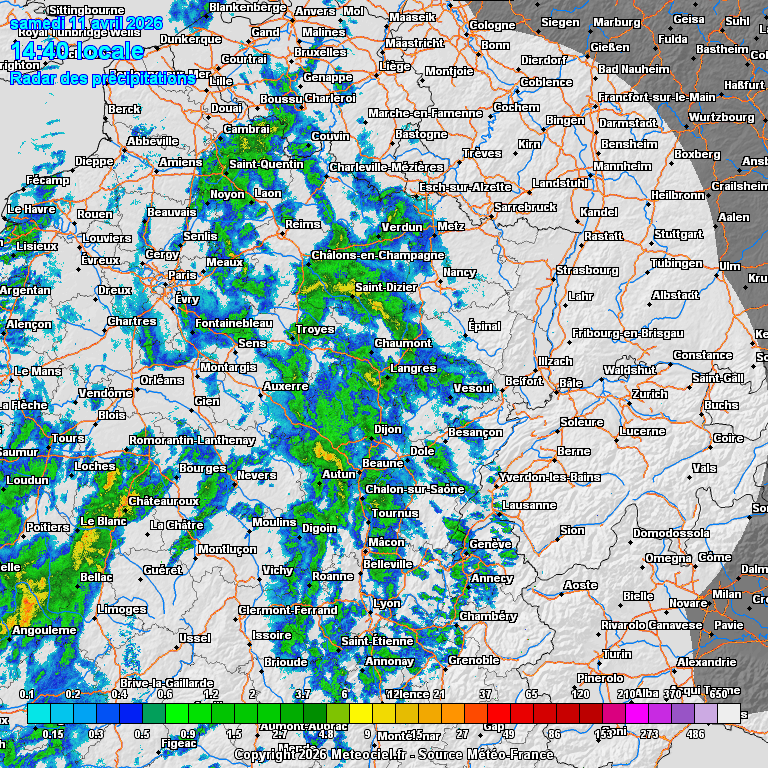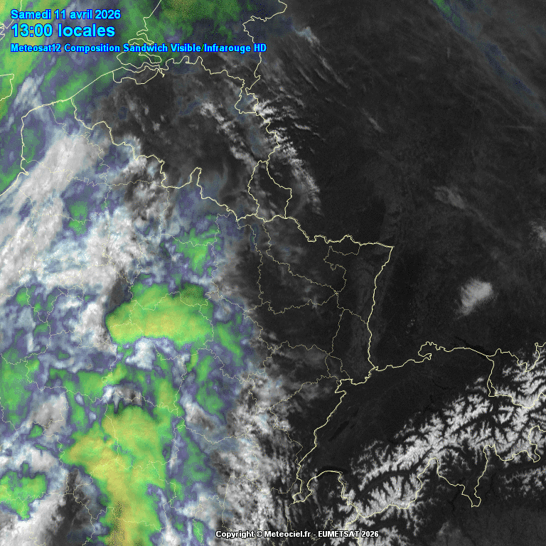 Sur l’animation ci-dessous, on constate que les formations nuageuses se développent de plus en plus. Cela montre notamment des structures nuageuses à développement vertical (plus la couleur va ver sle jaune / orange / rouge, plus cela indique un sommet élevé du nuage).